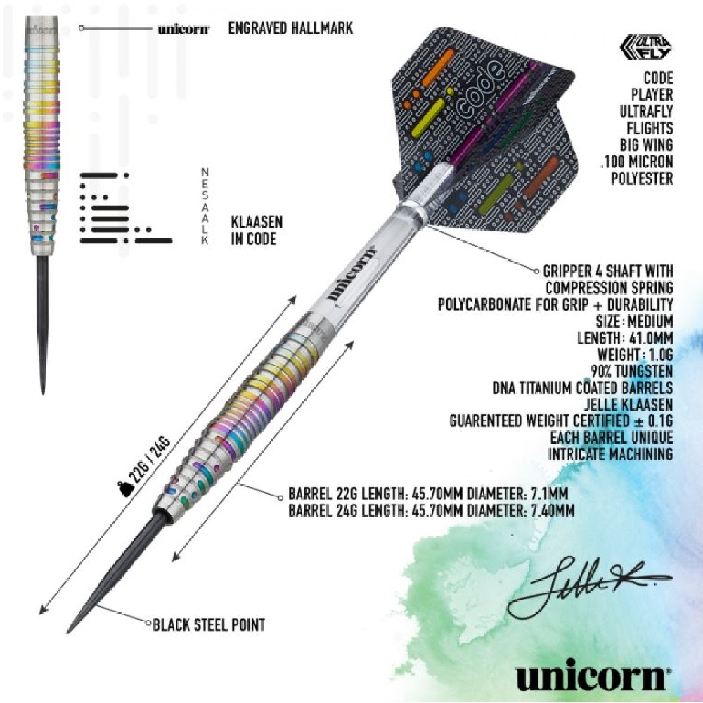 The Unicorn Code Player range of Darts feature a combination of ultimate grip with superb balance and aerodynamics